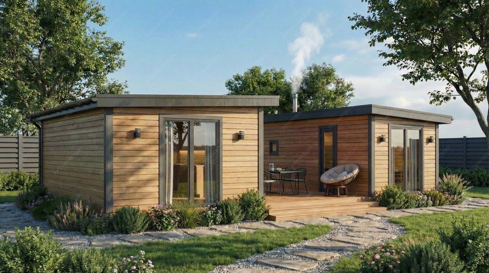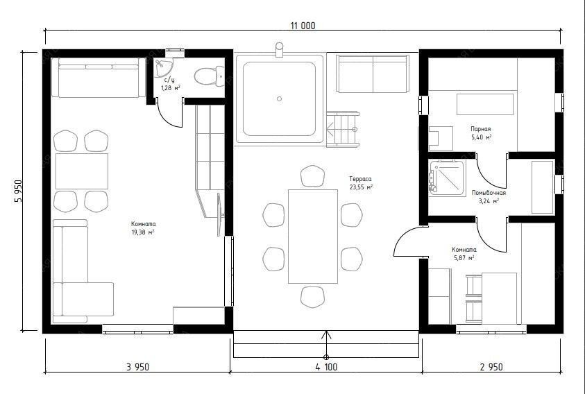 Баня «Эспера» реализует уникальную архитектурную концепцию, где открытая терраса становится центральным связующим звеном между двумя автономными блоками. Такое решение создает исключительную многофункциональность, позволяя одновременно использовать пространства для разных сценариев: шумного отдыха на просторной террасе (23,55 м²) и уединенного расслабления в одном из помещений.  Планировка демонстрирует чёткое функциональное зонирование. Один закрытый блок объединяет большую гостевую комнату (19,38 м²) и санузел, что идеально для приема компании. Второй блок целиком посвящен банным процедурам: здесь расположена светлая парная (5,4 м²) с двумя окнами-форточками, отдельная помывочная и своя компактная комната отдыха. Односкатная крыша и общие габариты 6х11 метров формируют современный, выразительный облик строения.  Использование натуральной древесины и качественный конструктив обеспечивают эффективное теплоудержание и долговечность. Проект «Эспера» предлагает редкий формат — это не просто баня, а целый гостевой комплекс с выделенной релаксационной зоной под открытым небом, где каждая деталь работает на создание атмосферы полного отрыва от городской суеты.
