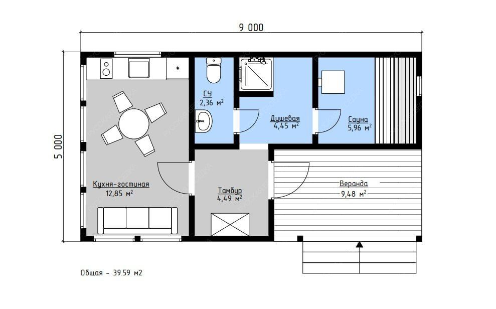Пространство организовано с учетом баланса функциональности и комфорта. Парная площадью 5,96 кв.м., душевая 4,45 кв.м., санузел и тамбур образуют техническое ядро. Кухня-гостиная 12,85 кв.м. становится смысловым центром для сбора компании, а открытая веранда 9,48 кв.м. расширяет возможности для отдыха на свежем воздухе. Конструкция выполнена из массива хвойных пород камерной сушки и клееного бруса. Внутренняя отделка парной — вагонка и полок из осины.