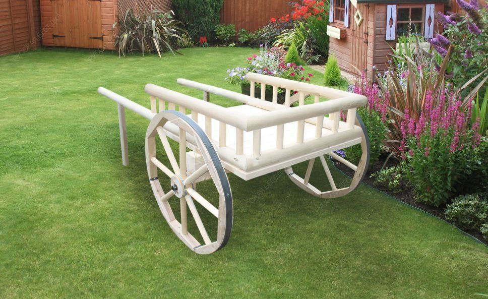 Любой загородный сад заслуживает внимания и достойного украшения. Из наиболее популярных ландшафтных аксессуаров можно выделить деревянные телеги, которые выделяют в отдельное направление благодаря разнообразию форм. Так, перед Вашими глазами находится телега-арба из дерева, которая прекрасно справляется с задачей украшения приусадебной территории. На ее поверхность, которая к тому же не скрыта за полуоткрытыми бортами, можно поставить любые цветочные композиции в горшках или кашпо. Конструкция телеги устойчива и рассчитана на большие нагрузки, так что на нее можно взгромоздить то, что душе угодно.