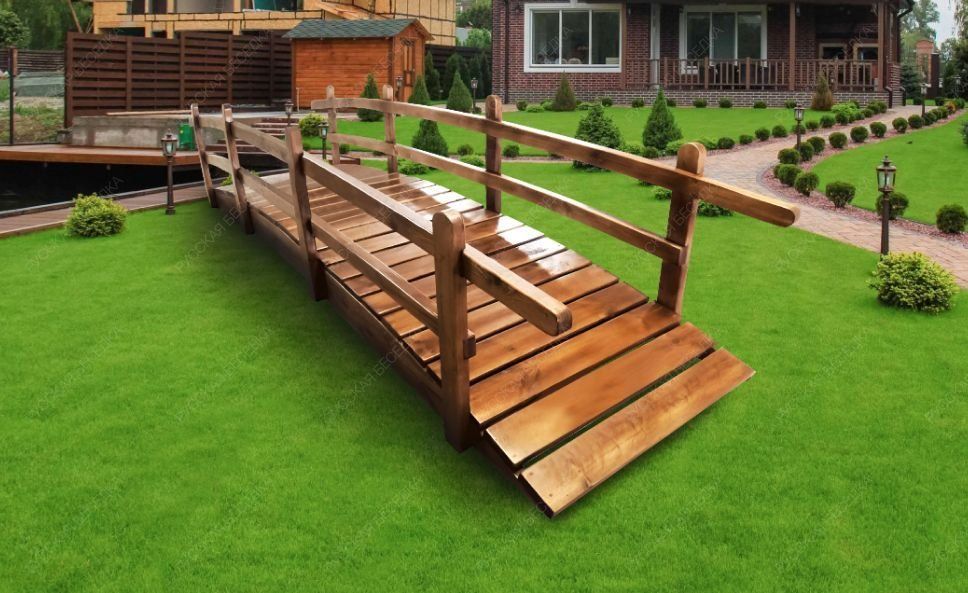 Длинный четырехметровый мост из дерева прекрасно впишется в ландшафт дачного участка и станет настоящей переправой через искусственный водоем. Мост совершенно безопасен и выдерживает одновременное нахождение на нем нескольких людей без каких-либо деформаций. Данная модель не только красится, но и лакируется для предания ей дополнительного шика. На фото мост окрашен в цвет тик. Вы можете купить деревянный мост с покраской в любой цвет на выбор.
