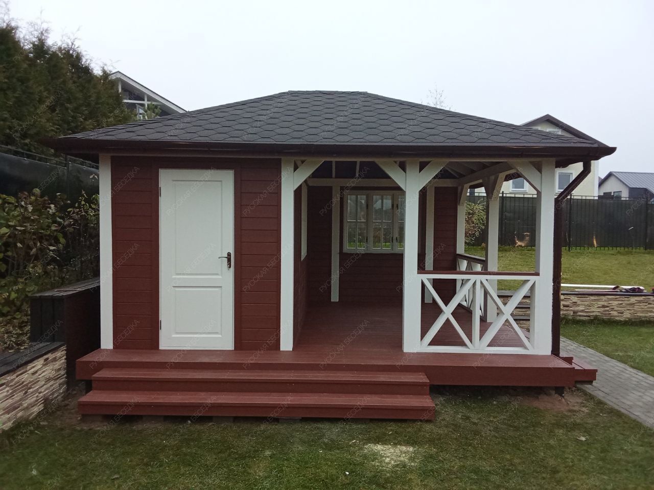 Имитация бруса 16×135 мм внутри, имитация бруса 21×135 мм снаружи.