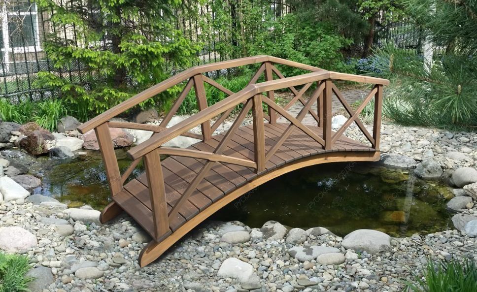 Ландшафтный дизайн совмещает в себе использование разных декоративных изделий, преимущественно из дерева. Если на вашей ухоженной территории есть искусственный пруд, его обязательно нужно облагородить. В этом поможет деревянный садовый мостик для сада. На фото представлена модель дачного мостика из дерева, которая будет удачно смотреться на большой территории. Его габариты достаточно велики, но при желании мы можем сделать данную модель по другим размерам. Дизайн садового мостика привлекателен. А если принять во внимание то, что в стоимость деревянного мостика входит и покраска, то можно купить такое изделие, которое будет гармонировать со всем остальным пространством и его элементами.