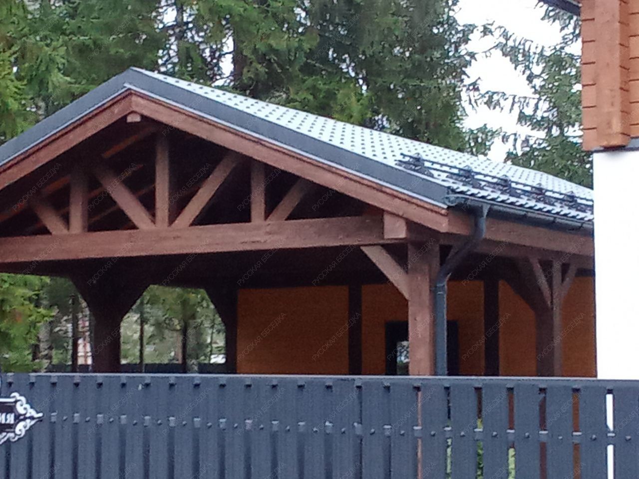 Для производства всех элементов навеса используется только отборная древесина без малейших дефектов, прошедшая камерную сушку и пропитку антисептиками. Навесу после защитной обработки лаком не страшны высокая влажность, а значит, можно быть уверенным, что дерево не растрескается, не разбухнет и не покоробится.