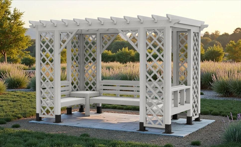 Пергола с навесом обеспечивает надежную защиту от солнечных лучей, создавая тенистое пространство для отдыха. Она станет идеальным местом для встреч с друзьями, чтения книг или приема пищи на свежем воздухе.
