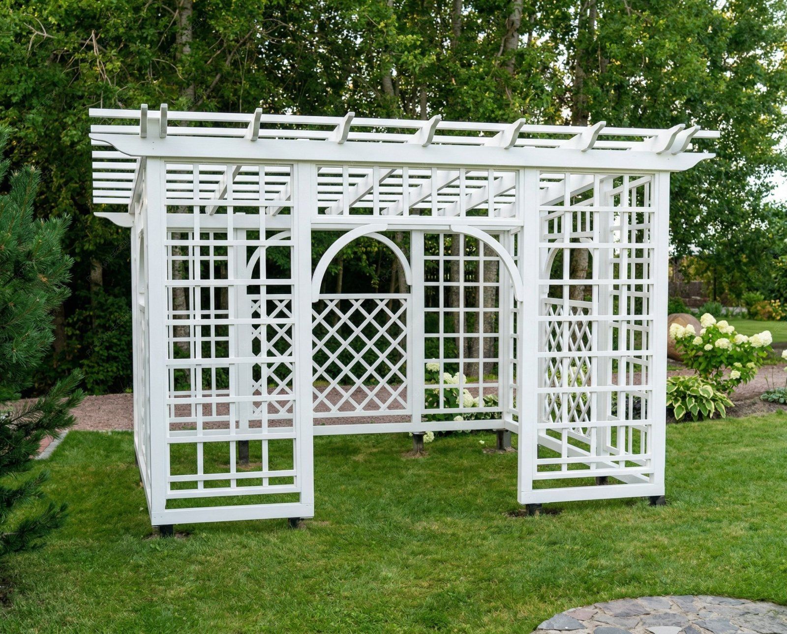 Пергола с навесом обеспечивает надежную защиту от солнечных лучей, создавая тенистое пространство для отдыха. Она станет идеальным местом для встреч с друзьями, чтения книг или приема пищи на свежем воздухе.
