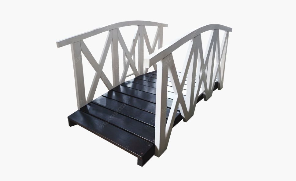 Деревянный мост строгого дизайна подходит для большинства стилей ландшафтного дизайна. Окрашенный в цвета согласно общей цветовой гамме дома и декоративных элементов он станет гармоничной частью рукотворной композиции, придавая участку оттенок романтики и изящности. Помимо того, что мостик для декора сада является красивым изделием, он наделен и практической функцией - по нему можно ходить, останавливаясь, чтобы полюбоваться на шикарные виды собственного цветника.