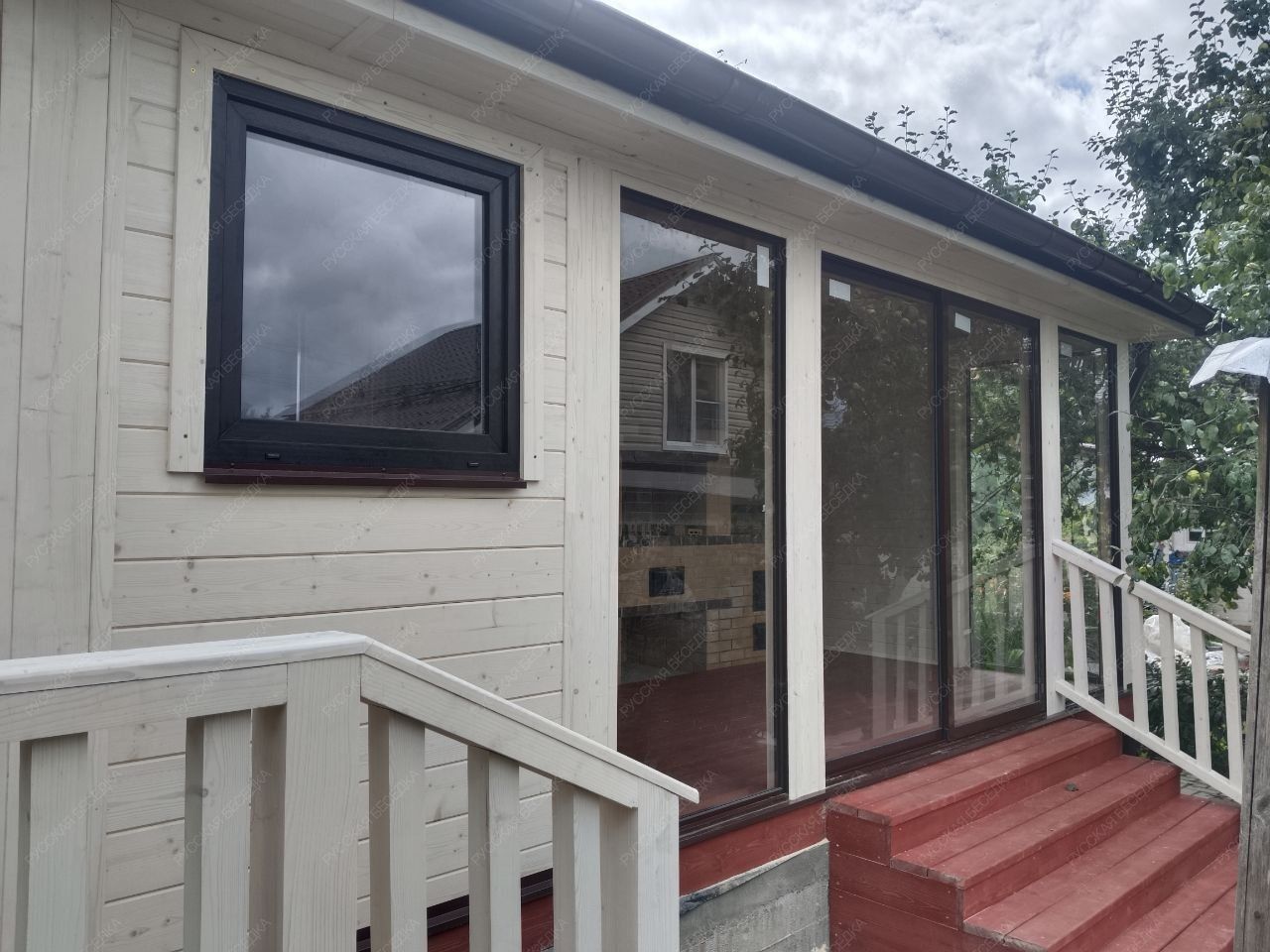 Раздвижная алюминиевая система. Окна в бронировочной пленке. Цвет пластика белый или коричневый.